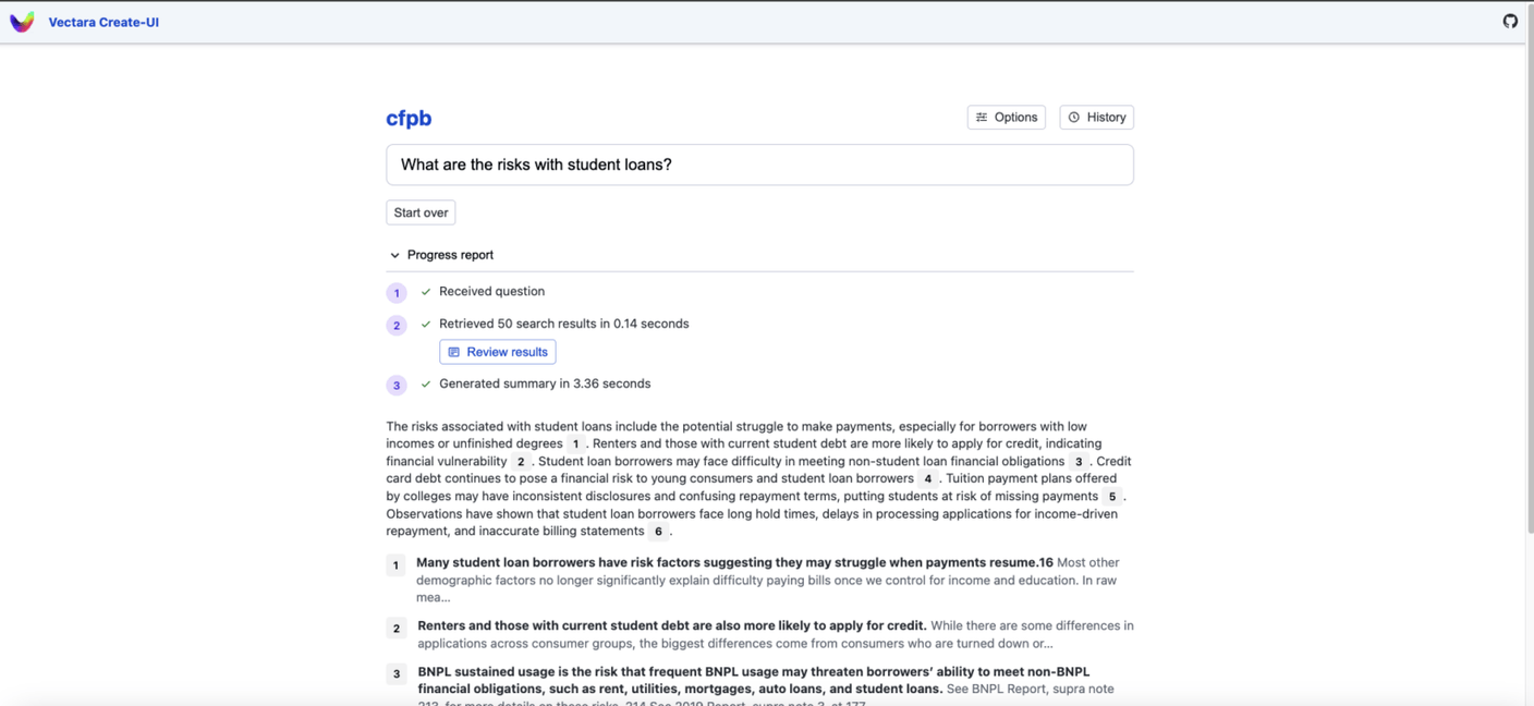 Now that the data is ingested into Vectara, we can issue queries and chat with the data using Vectara’s Query API, using a tool like vectara-answer or create-ui.