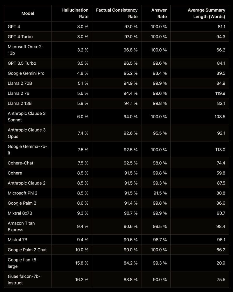 On our updated leaderboard, both Claude 3 Opus and Sonnet models have shown higher factual consistency rates compared to Google’s recently introduced Gemma model. It’s noteworthy, however, that despite being considered as the more “powerful,” Claude 3 Opus ranks slightly below Claude 3 Sonnet in our leaderboard. This ranking, based on a limited evaluation set, should not be hastily interpreted as a definitive measure of superiority between the models in the context of model hallucination.