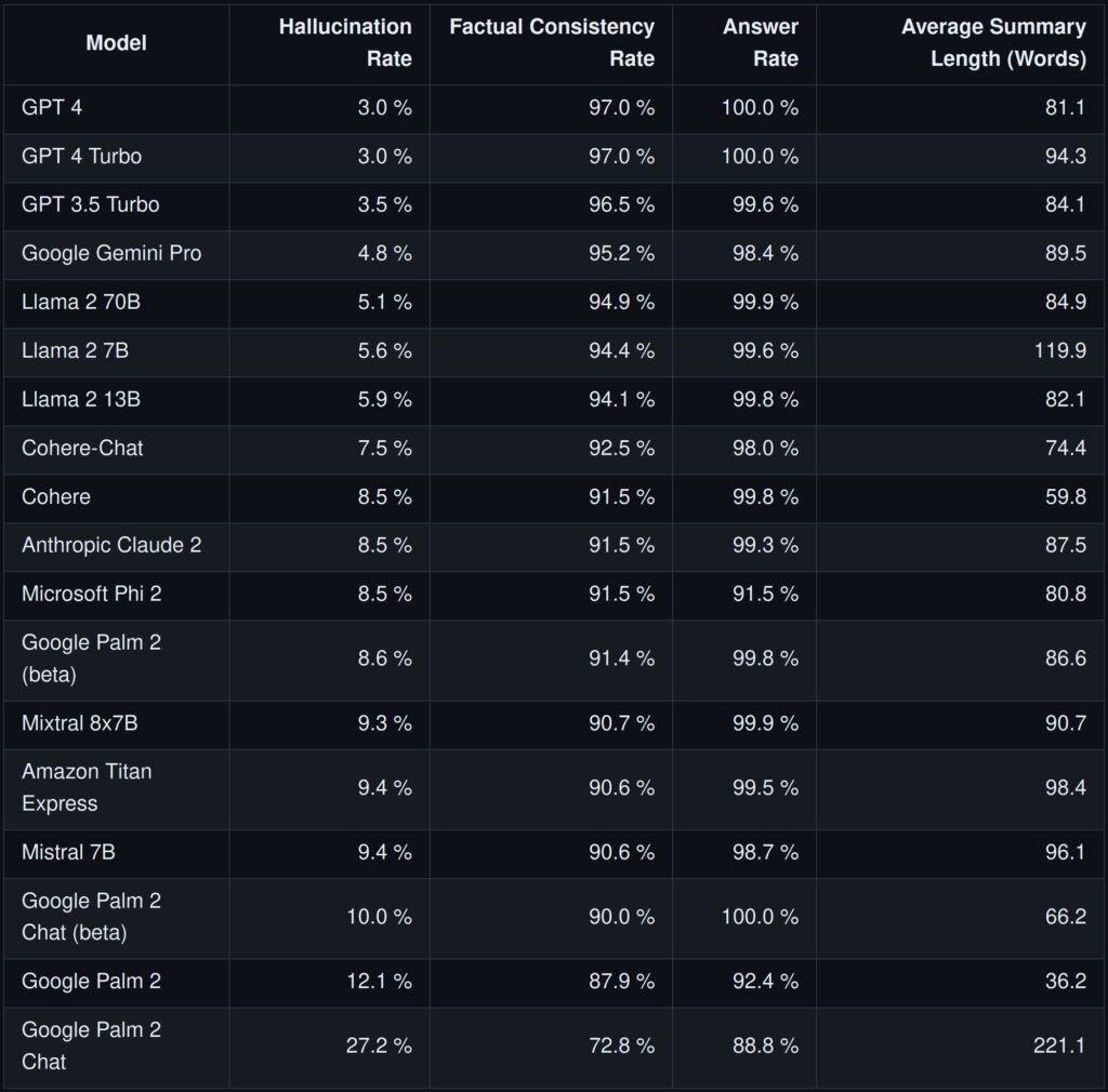 The table below, which reproduces the leaderboard as of January 16, 2024, shows Phi 2 hallucinating in 8.5% of summaries, the same as Cohere and Claude 2, and slightly better than Mixtral 8x7B and Titan Express.