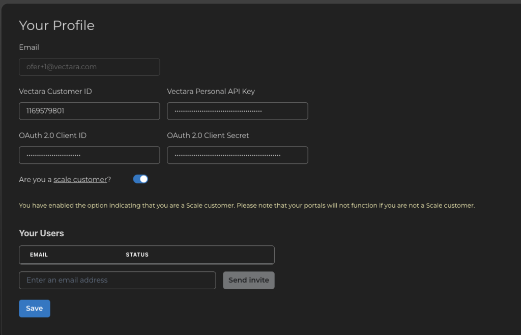 - Copy your Vectara account ID, and your Personal API key into the appropriate boxes in your profile