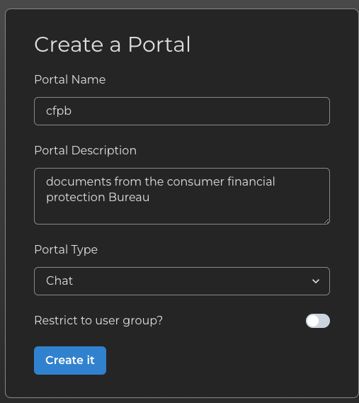 In this example, we’ll create a portal based on a few PDF documents from the CFPB website, covering various topics in financial regulation. We choose the “Chat” portal type for a chat interface, but that can of course be changed later.