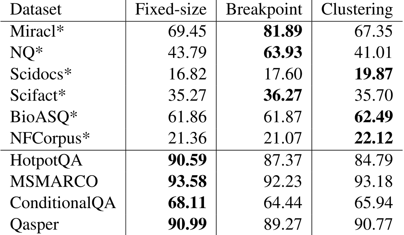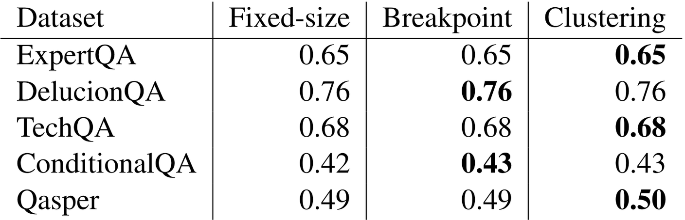 - Task Dependency: The effectiveness of Semantic Chunking varied by task (implied by dataset choices), with its advantages often overshadowed by the quality of the embedding model or dataset structure.