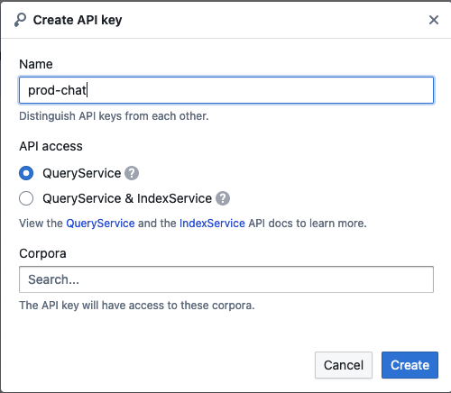 - CreateApiKey: Creates a new API key. When you create a new API key, you’ll need to define whether it’s for “Serving” (read-only) or for “Indexing” (read-write). You can give it one or more corpora to be able to access.