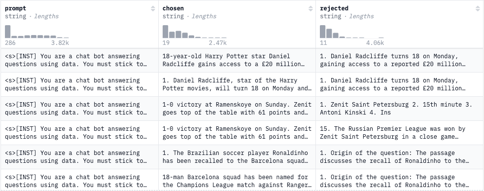 The next step is to construct the preference data by ranking the model responses by their factuality. We employ the HHEM model to score the responses and then construct the preference data by selecting the responses with HHEM score > 0.8 as the more favored responses and the responses with HHEM score < 0.5 as the less favored responses. The generated preference data looks like this: