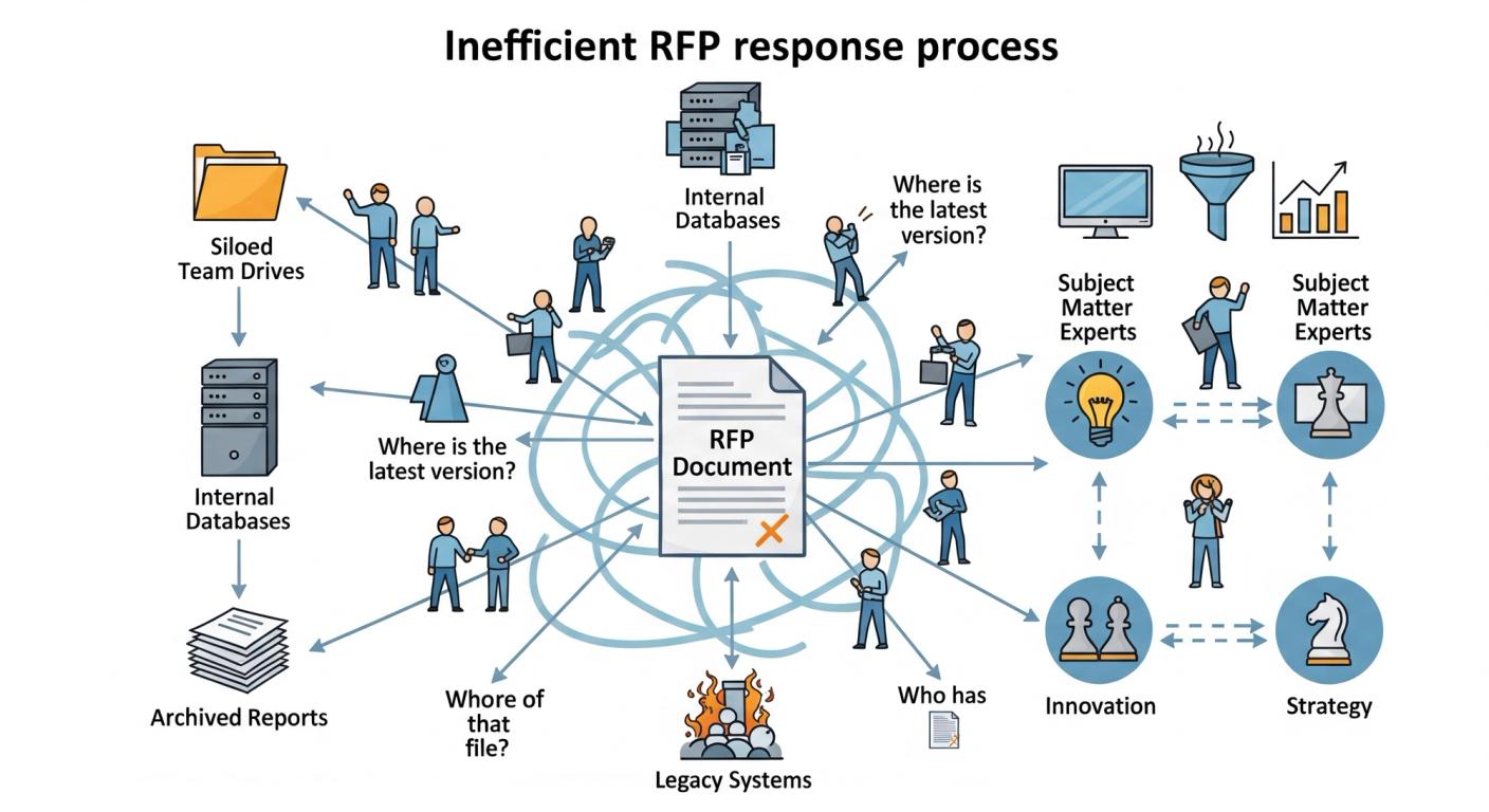 The frantic, last-minute scramble to respond to an RFP is a symptom of a much bigger pain: the disorganization and inaccessibility of critical enterprise knowledge. For too long, we have accepted this drudgery as a cost of doing business, and sacrificed thousands of hours of our best people's time to the manual, repetitive labor of “digital archaeology”.