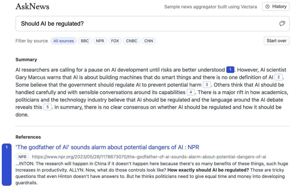 When a user submits a question, AskNews uses Vectara’s Query API to retrieve the most relevant articles, which Vectara stores as documents in a vector database. It treats these results as the source of truth when answering the user’s question. AskNews then naturally enables the user to validate its answers by cross-referencing the results it used to generate its answer.