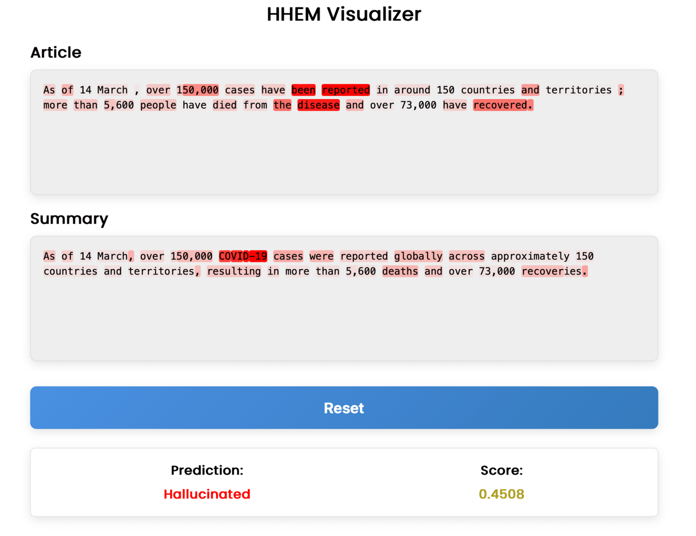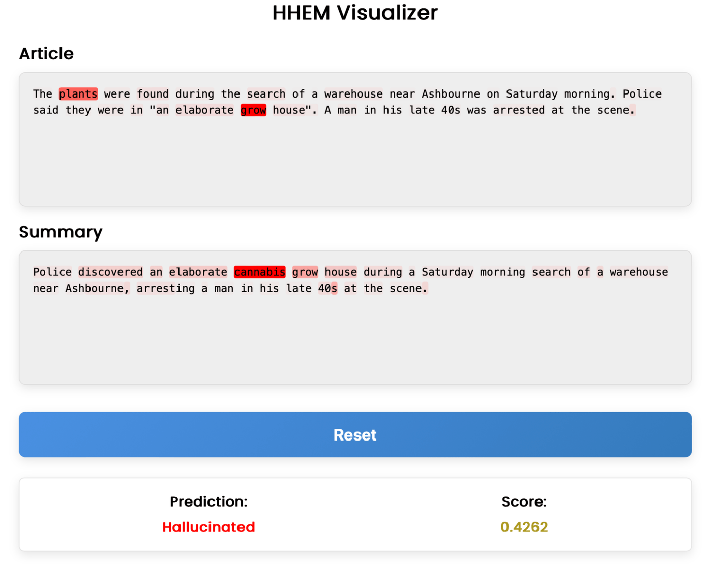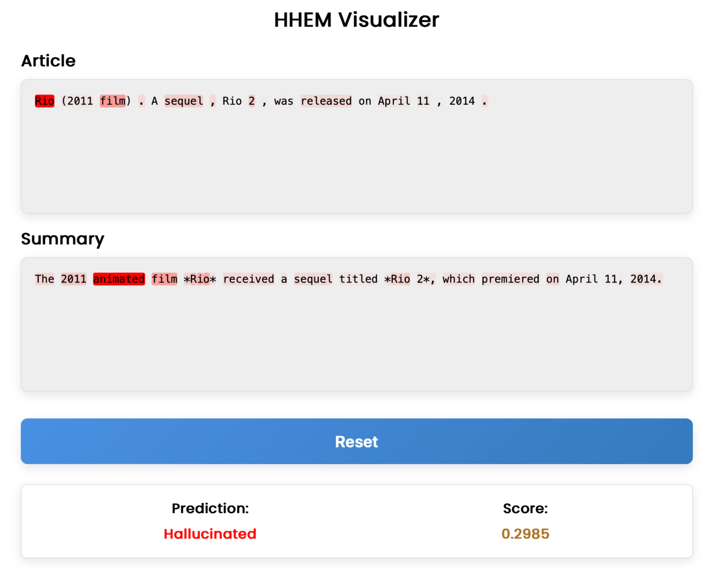 In the screenshots below, tokens are highlighted in bold where the opaqueness level reflects the importance of that token and its contribution to the overall hallucination score. The importance score is derived from the gradient norms of HHEM’s prediction scores with respect to input token embeddings.