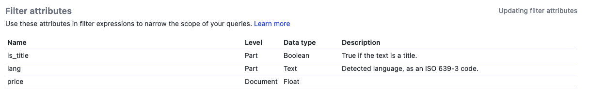 Depending on the corpus size, it can take a bit of time to do this background process, but for many corpora, this process completes in a few minutes. In the meantime, we’ve crafted the filter update to allow you to continue to query with your “old” filters until the new filters are applied. Afterwards, you will be able to execute filters with your “price” field just as though it always existed.Filters can be created, updated, renamed, or deleted through this workflow.