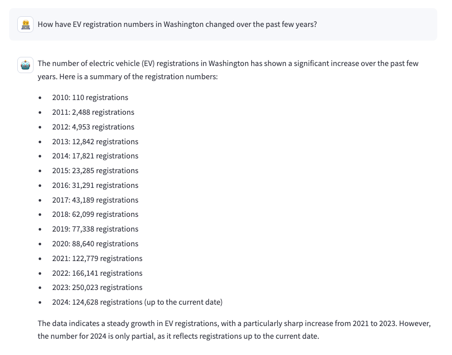 agent.chat(“How have EV registration numbers in Washington changed over the past few years?”)