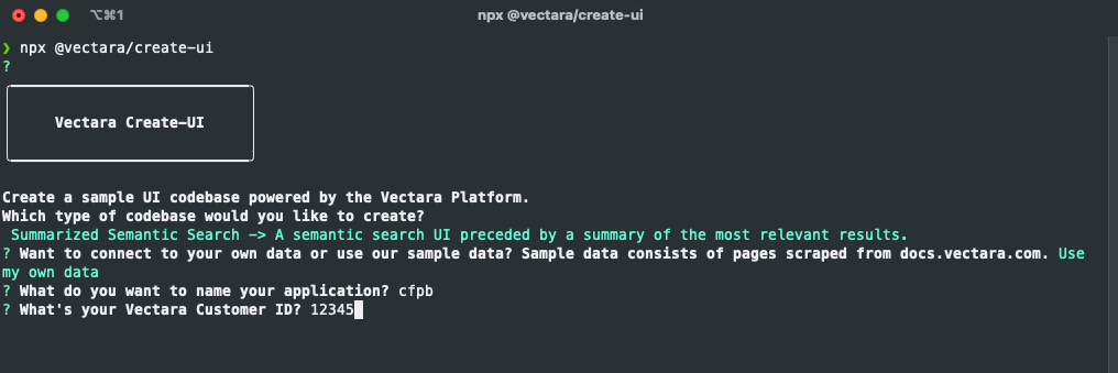 - Then we choose the “Use my own data”’ in order to point the create-ui application to the CFPB documents already ingested into Vectara.