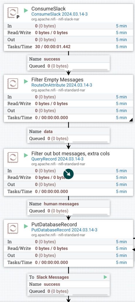 For the Vectara integration, we used the same design approach as explained in that blog to pre-process the Slack messages before loading them into Vectara. This illustrates the modularity and flexibility of Datavolo where one data flow can be used for many use cases. For this use case, we processed the Slack messages as illustrated here: