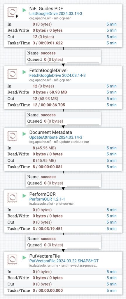 The second part of the content load into the Vectara corpus was the user, administrator and developer guides and tutorial PDFs for Apache NiFi. We were able to pull these guides from a particular Google Drive location, enrich these files with the needed attributes for the Vectara corpus, perform OCR on the documents to extract the important text, and finally load them into the same corpus as we are using for our Slack messages, as illustrated below: