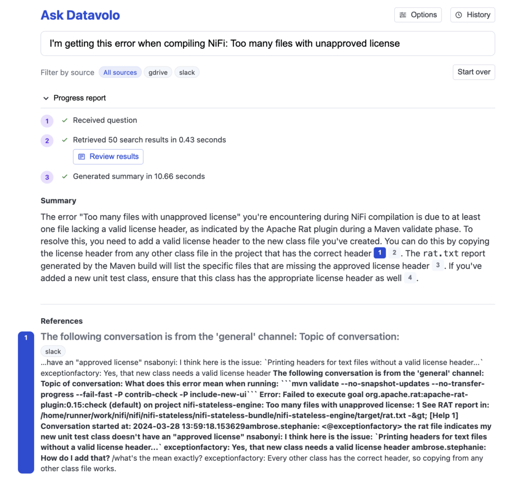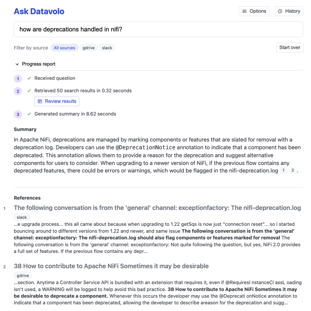 Returning to the use case at hand, while the Datavolo documentation is comprehensive, there are always real-world complexities that cannot be covered by just static docs. A lot of these experiences, issues, and solutions are captured in community conversations that happen within messaging platforms like Slack. To leverage these additional knowledge sources, we will combine the docs with a stream of ongoing Slack conversations that contain previously answered questions and insights and index both sources into Vectara. This will greatly enhance users’ search results in the Vectara app!