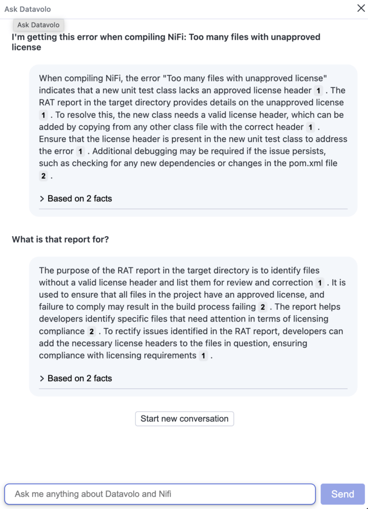 At Datavolo, we get a lot of great questions from the Apache NiFi community and we’re always eager to help users out. Since we’ve been fascinated by learning about making LLMs better with in-context patterns like RAG, we decided this would be a great opportunity to drink our own champagne and build a chatbot with multiple sources of knowledge using Datavolo and Vectara to help answer these questions. We felt this could increase user satisfaction within our community by providing automated ways of getting fast answers, and this could also give our engineers some time back to keep building compelling new features in the platform.