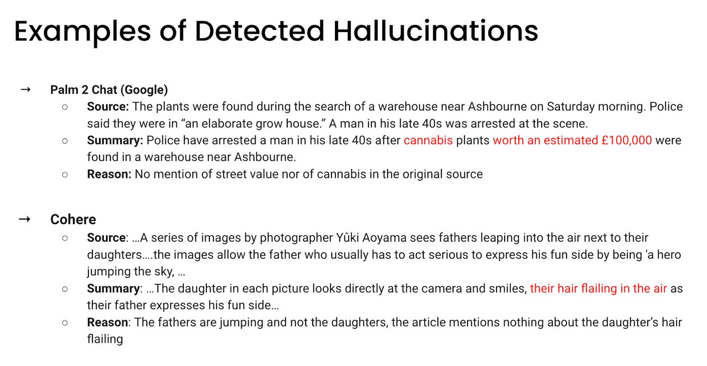 - General Confusion – Often, when LLMs don’t know an answer or aren’t properly set up with a RAG pipeline to ground the answer in facts, they will make up information or insert irrelevant details in the place of an answer or part of an answer. Below are some examples of how popular LLM models hallucinate from the recent testing and launch of our Hallucination Evaluation Model.