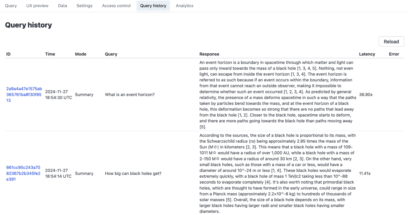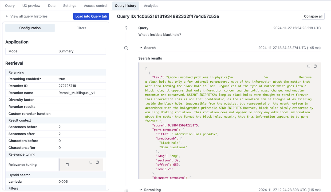 Query Observability adds more visibility for your query history and provides insight into how the system works to give you confidence in your understanding and to build trust in AI systems. With it, you can assess past configurations, troubleshoot issues, and continuously optimize queries to deliver a valuable search experience. By helping you see what works—and why—this feature enhances both the effectiveness of your corpus management and the overall user experience.
