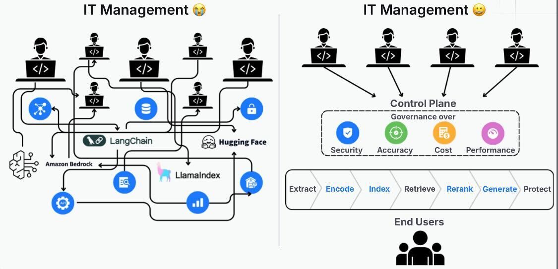RAG Sprawl is what happens when every team builds its own custom RAG stack. Different frameworks. Different Language Models. Different vector databases. Different security mechanisms. No centralized control plane for IT. No versioning, no audit trail, no enterprise governance, no departmental inference cost tracking. And critically—no way to explain or reproduce what your AI assistant or agent just told a customer.