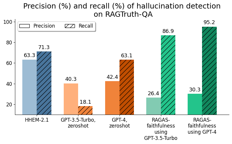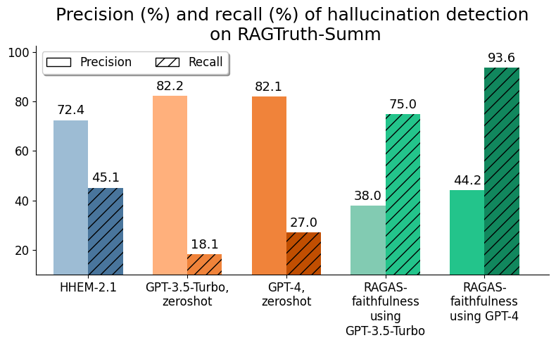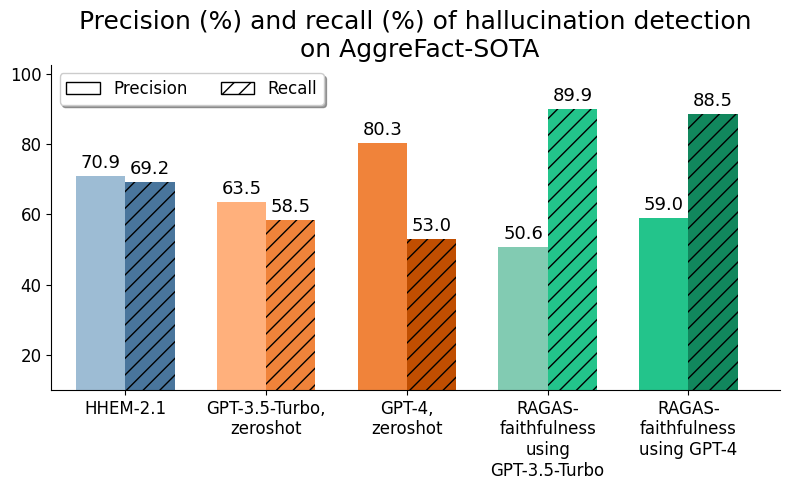 HHEM-2.1 is more accurate than its predecessors not only in identifying hallucinations where they occur (“recall”) but also in being correct when it predicts that a summary response is a hallucination (“precision”).
