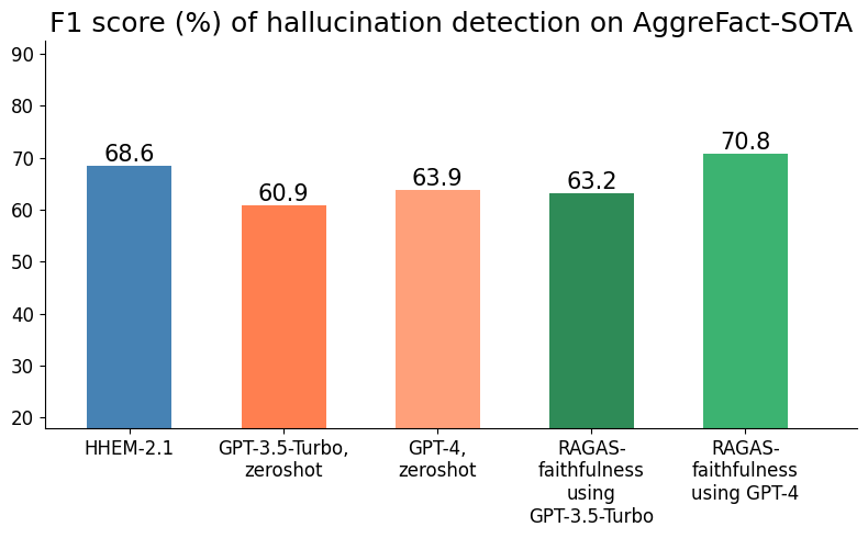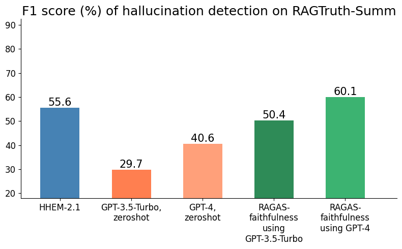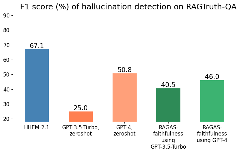 In terms of F1 score (Figures 1 to 3), HHEM-2.1 outperforms all baselines by significant margins on all evaluation sets, except when compared with RAGAS-Faithfulness using GPT–4 as the underlying model. RAGAS has the downside of being relatively slow – it may take RAGAS as much as 35 seconds to make a judgment with GPT-4 for a 4096-token context (and a substantial cost) whereas in HHEM-2.1, it’s only 0.6 seconds on a consumer-level RTX 3090 GPU. According to F1 score, HHEM-2.1 is at least 1.5x better than GPT-3.5-Turbo on RAGTruth’s Summarization and Question Answering subsets, respectively, and over 30% (relative) better than GPT-4.