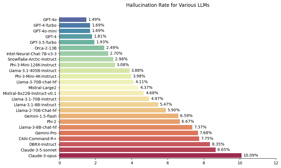 Alongside the model, we also built the HHEM leaderboard, which ranks LLMs based on their propensity to hallucinate, measuring a “hallucination rate” for leading commercial and open-source LLMs.