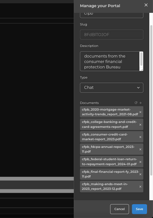 In this example, we’ll create a portal based on a few PDF documents from the CFPB website, covering various topics in financial regulation. We choose the “Chat” portal type for a chat interface, but that can of course be changed later.