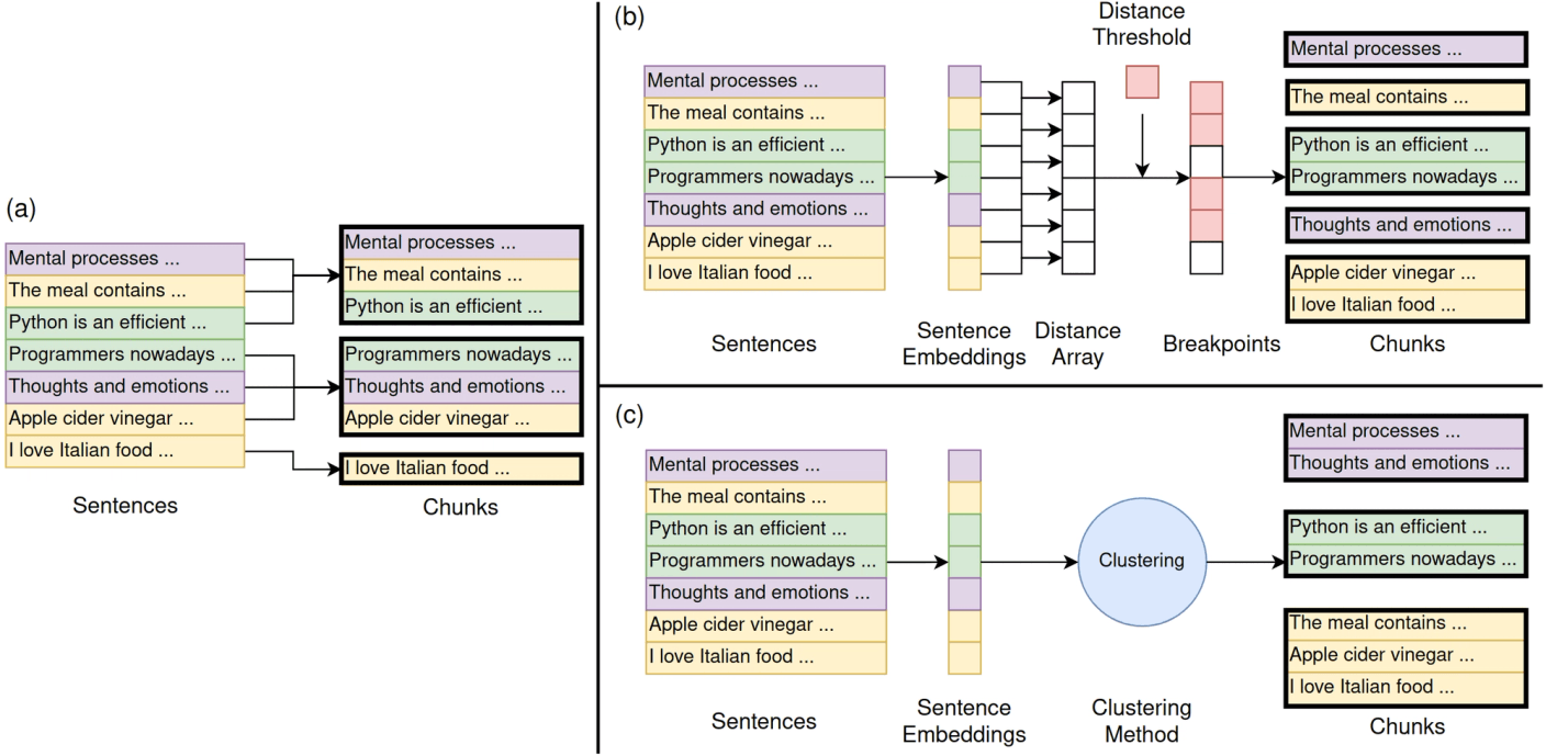 - Clustering-based: Semantically similar sentences are grouped together, potentially combining non-consecutive text to form topic-based chunks.