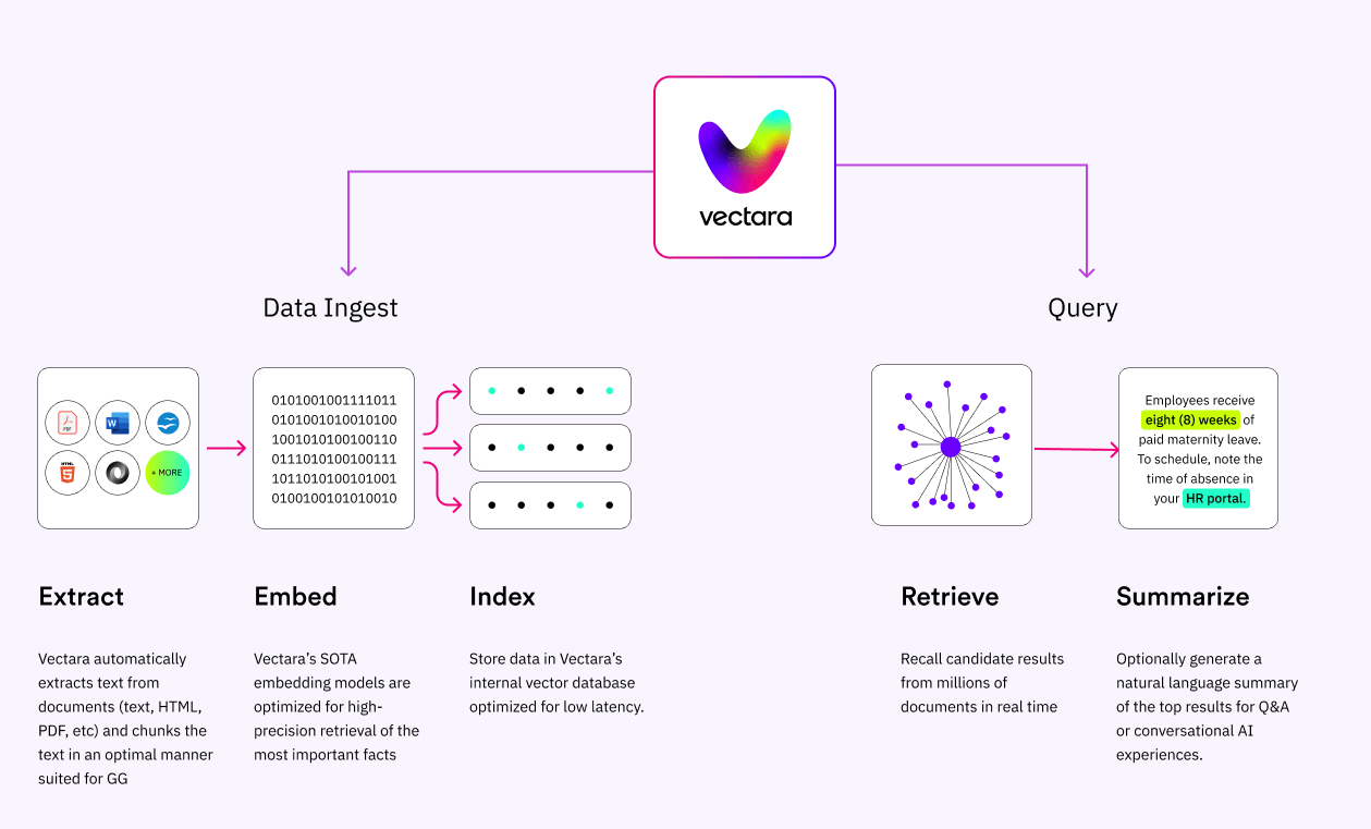 Data processing. Vectara supports various file types for ingestion including markdown, PDF, PPT, DOC, HTML and many others. At ingestion time, the text is automatically extracted from the files, and chunked into sentences. Then a vector embedding is computed for each chunk, so you don’t need to call any additional service for that.