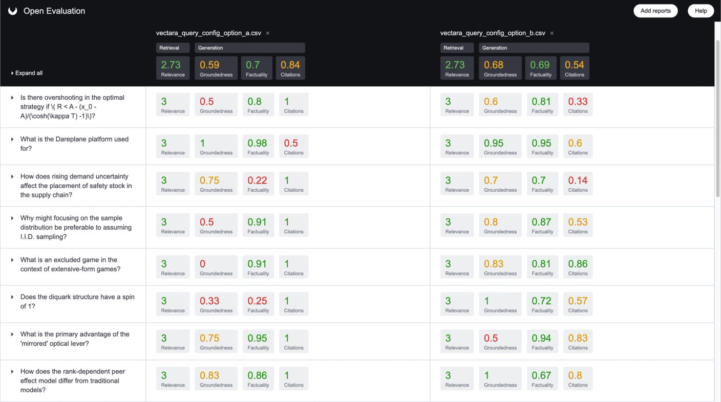 We designed Open Evaluation to surface the patterns and insights represented within a report’s metrics. After generating reports with Open RAG Eval, you can load a report into Open Evaluation and use the UI to compare various metrics across queries with a report. You can also load multiple reports to compare metrics across reports. By analyzing how your RAG configurations map to changes in metrics across reports, you can zero in on the tweaks that will optimize your RAG system.