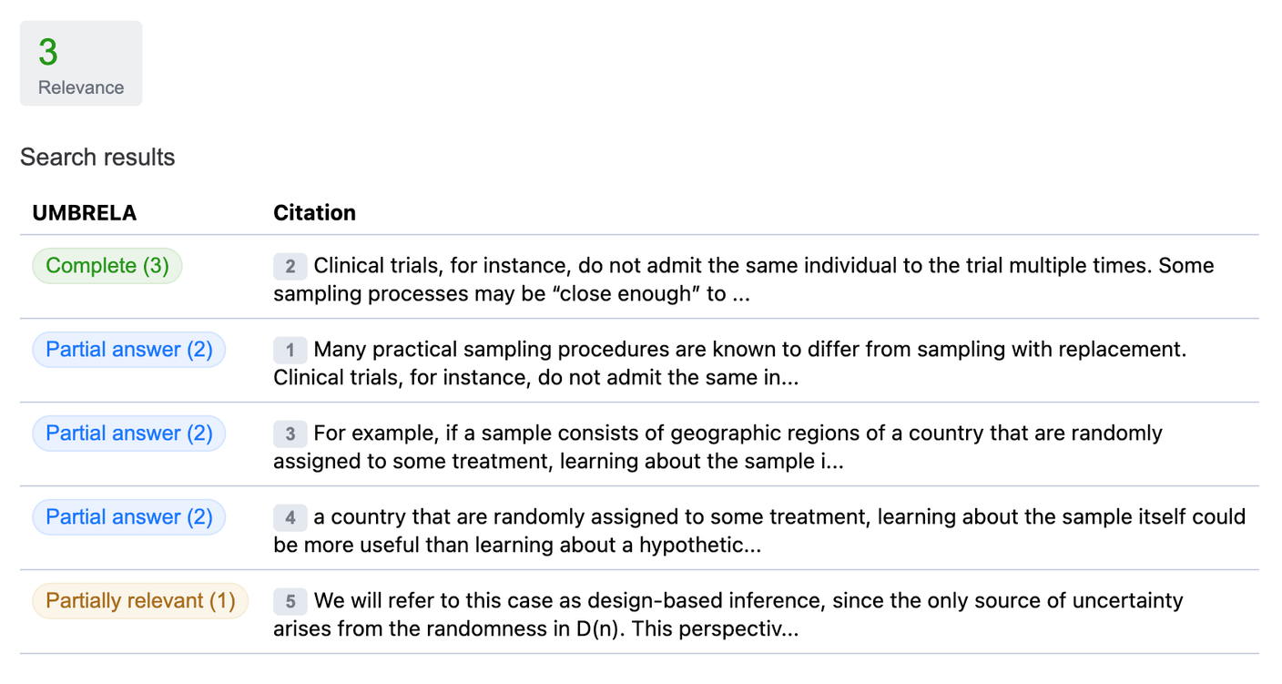 A screenshot of the UI that demonstrates the relevance score, which is the highest UMBRELA score of those calculated. The interface also provides the citation number used by the generated answer, so you can cross-reference various parts of the generated answer with the search results.
