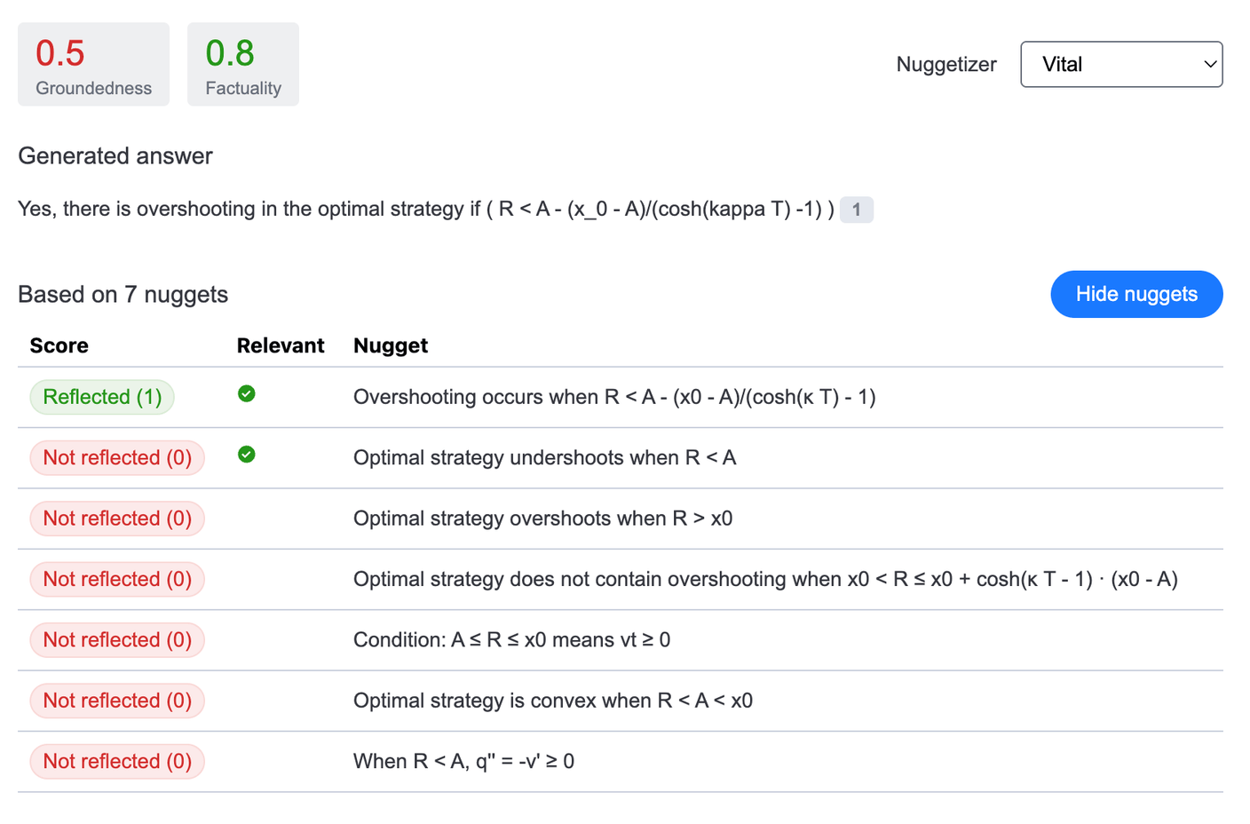 A screenshot of the UI that demonstrates the generated answer, the groundedness score, which is an average of the relevant nuggets’ scores, and the factuality score as calculated by HHEM. You can click on the inline citation numbers within the generated answer to view the referenced search results. In the nuggets section, you can select a different nuggetizer algorithm to calculate the groundedness score with an alternate method.