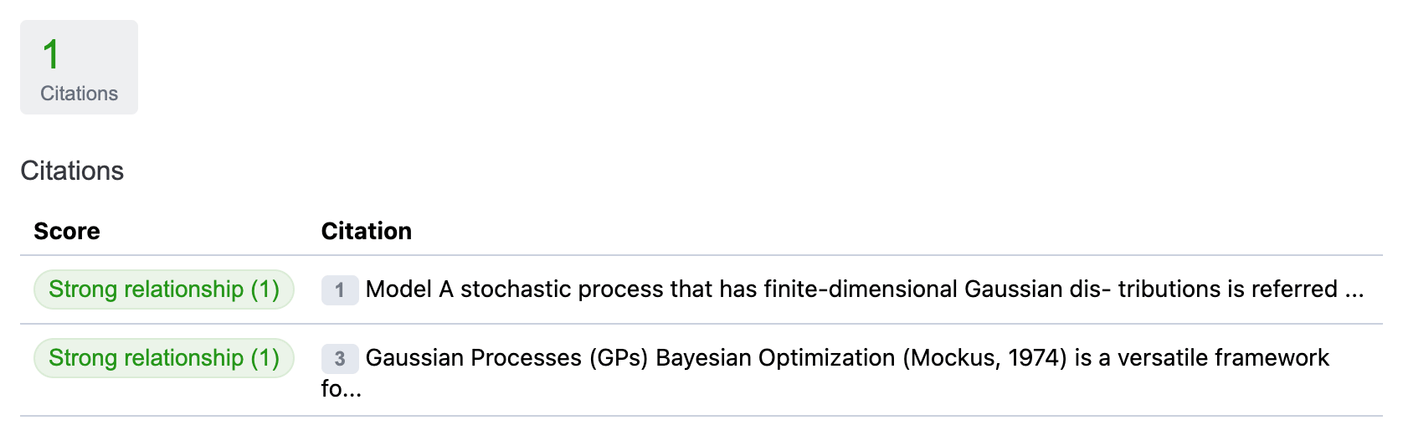A screenshot of the UI that demonstrates the citations score. The score is an average of the scores for each citation. You can click the citation number to view the referenced search result.