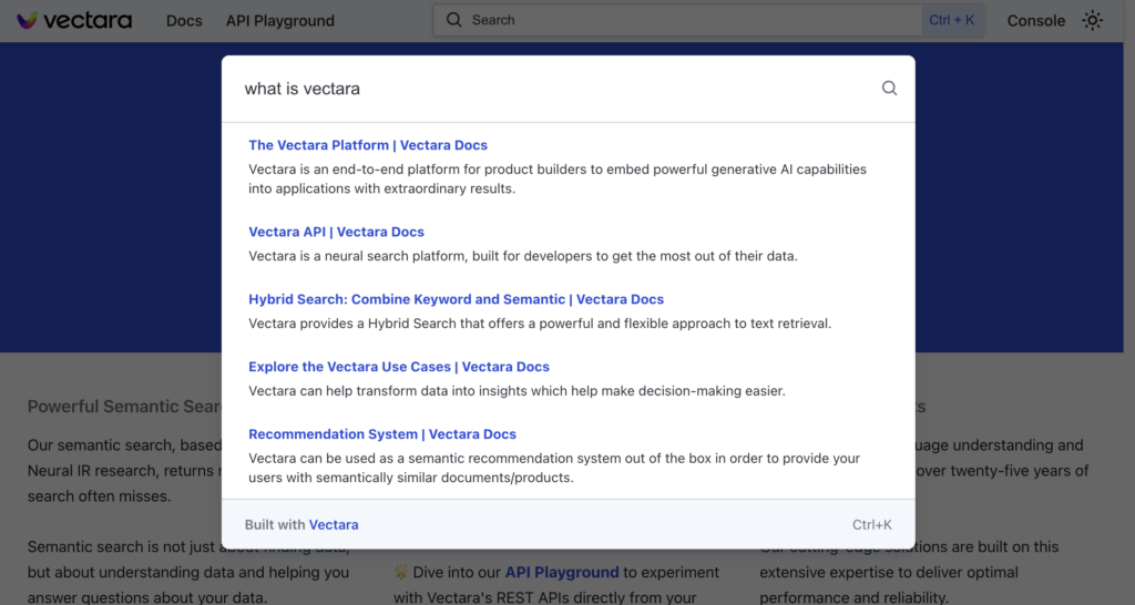 We optimized the user experience for simplicity and usability. Once you plug React-Search into your app, your users will be able to click the search input or use the Ctrl + K keyboard shortcut to open up the search modal. When they execute a search, Vectara returns the results that are the closest semantic matches to the user’s query.
