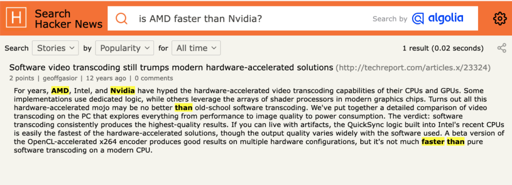 For example, if I search for “is AMD faster than Nvidia?”, I get a single result from 12 years ago: