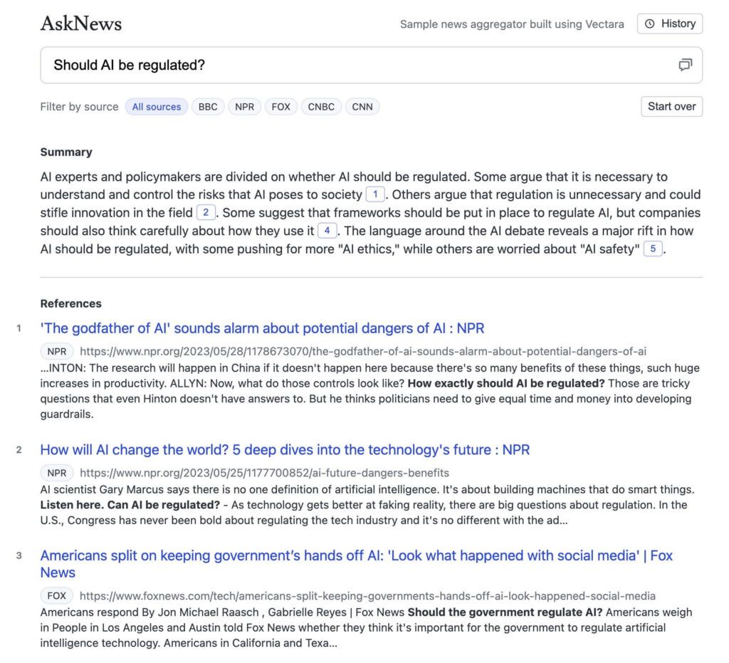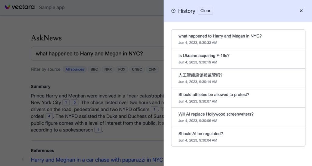 When a user submits a question, AskNews uses Vectara’s Query API to retrieve the most relevant articles, which Vectara stores as documents in a vector database. It treats these results as the source of truth when answering the user’s question. AskNews then naturally enables the user to validate its answers by cross-referencing the results it used to generate its answer.