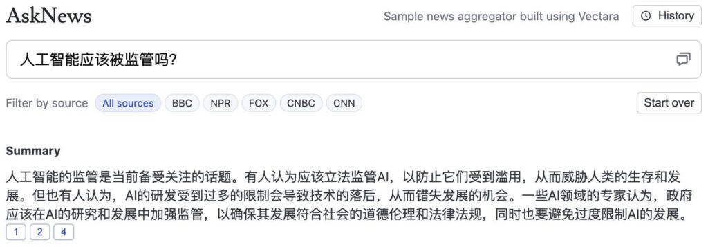 The idea is to enable the user to interact with the software as naturally as possible, even if that means asking a question in one’s native language. That’s why AskNews will provide the same response to someone asking “Should AI be regulated?” in English or “人工智能应该被监管吗?”, which is the same question in Simplified Chinese.