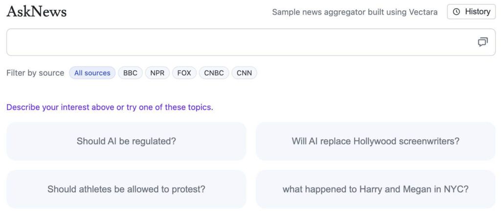 AskNews enables the user to ask a question about recent events. It will retrieve the most relevant results from BBC, NPR, FOX, CNBC, and CNN news articles, and summarize them into an answer, backed up by citations.