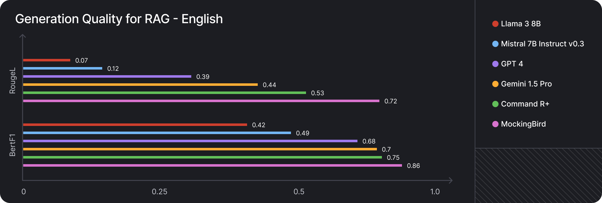 Its top-of-the-line hallucination mitigation capabilities make it perfect for enterprise RAG and autonomous agent use cases. Mockingbird outperforms GPT-4 and other major models on key metrics in RAG output and citation precision/recall.