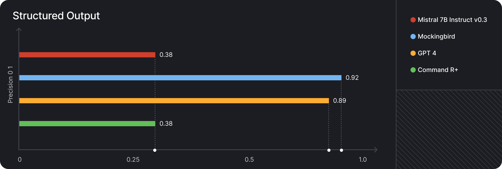 Structured output lets RAG connect to downstream tasks such as function calling or enabling agentic behavior. GPT-4 is the closest competitor to Mockingbird in precision.