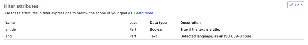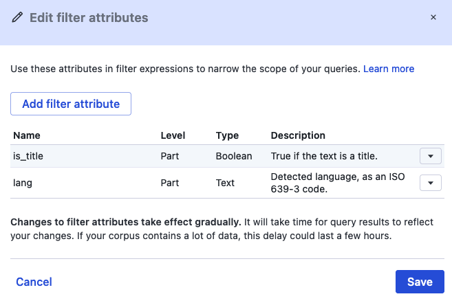 Depending on the corpus size, it can take a bit of time to do this background process, but for many corpora, this process completes in a few minutes. In the meantime, we’ve crafted the filter update to allow you to continue to query with your “old” filters until the new filters are applied. Afterwards, you will be able to execute filters with your “price” field just as though it always existed.Filters can be created, updated, renamed, or deleted through this workflow.
